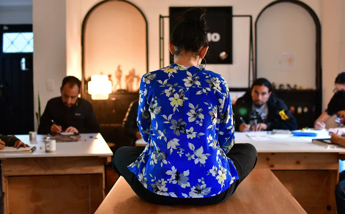 Los estudiantes pueden desplazarse libremente por el espacio, cambiar de ángulo y decidir desde dónde dibujar, priorizando la intención expresiva sobre la técnica tradicional. Las sesiones incluyen retroalimentación individual y colectiva, centrada en la claridad, el sentido y la evolución del trazo, más que en su corrección formal.