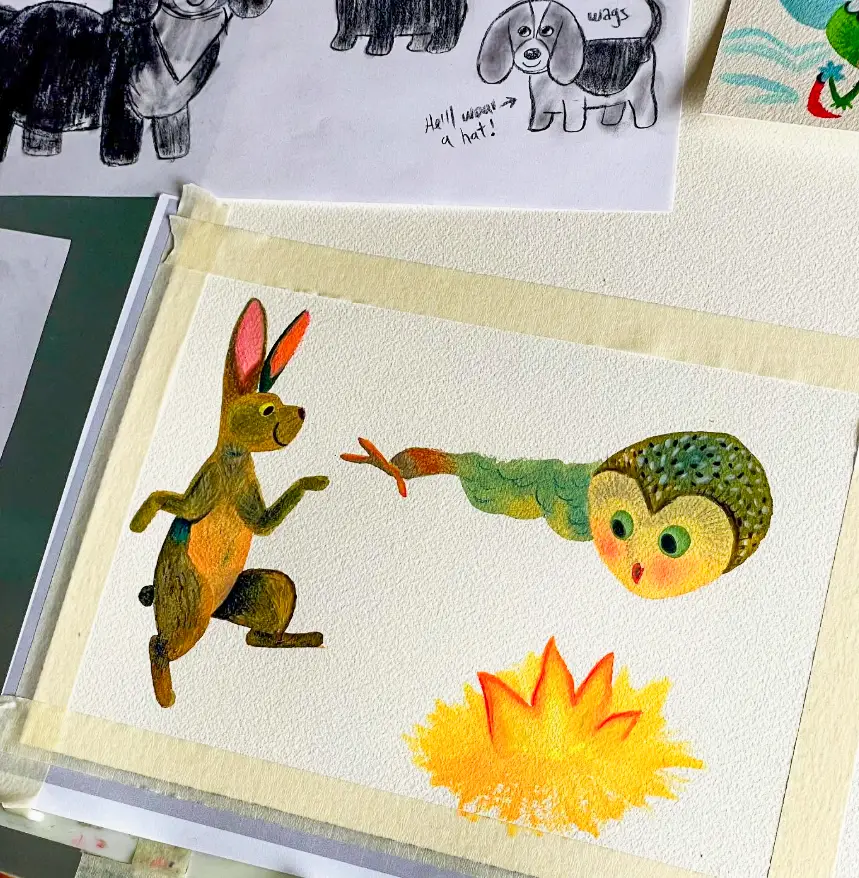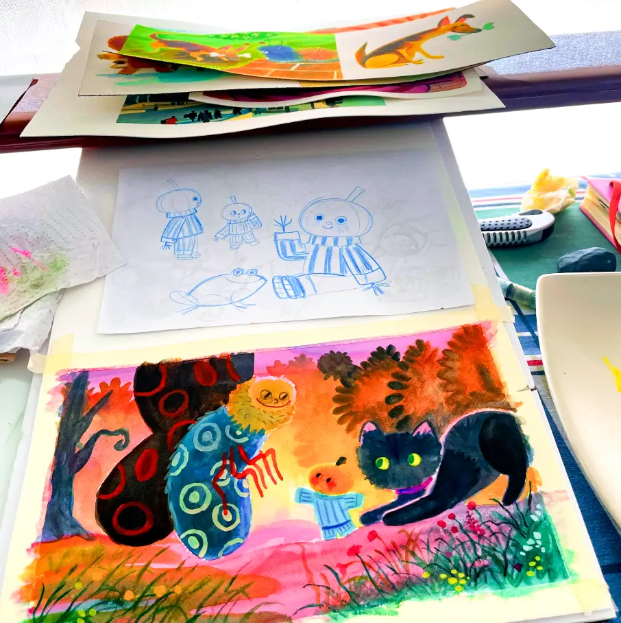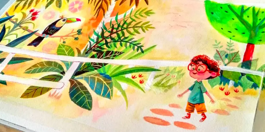 Este es el único taller de concept art analógico en Bogotá. Aprenderás control de agua en acuarela, mezcla de colores, técnica wet-on-wet, reserva de blancos, sombras cromáticas y perspectiva atmosférica en pintura mientras construyes un universo visual completo listo para concept art para animación, cómic e ilustración infantil.